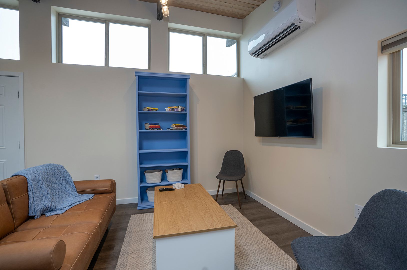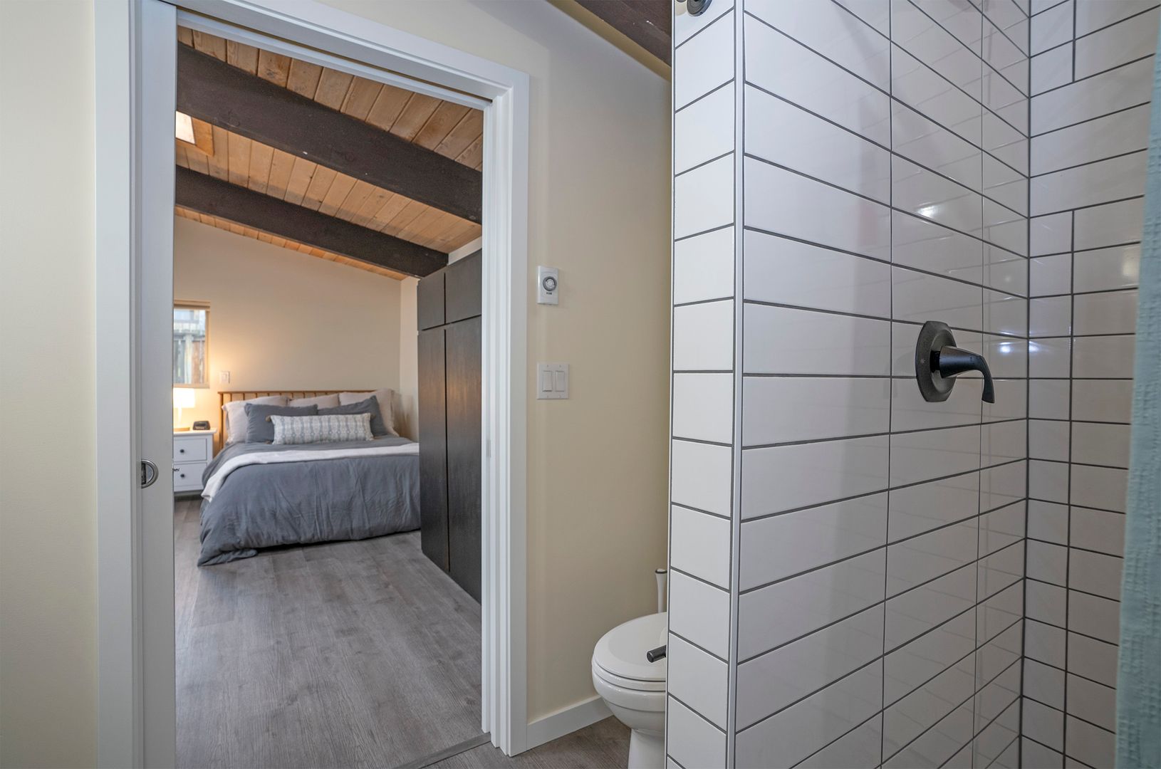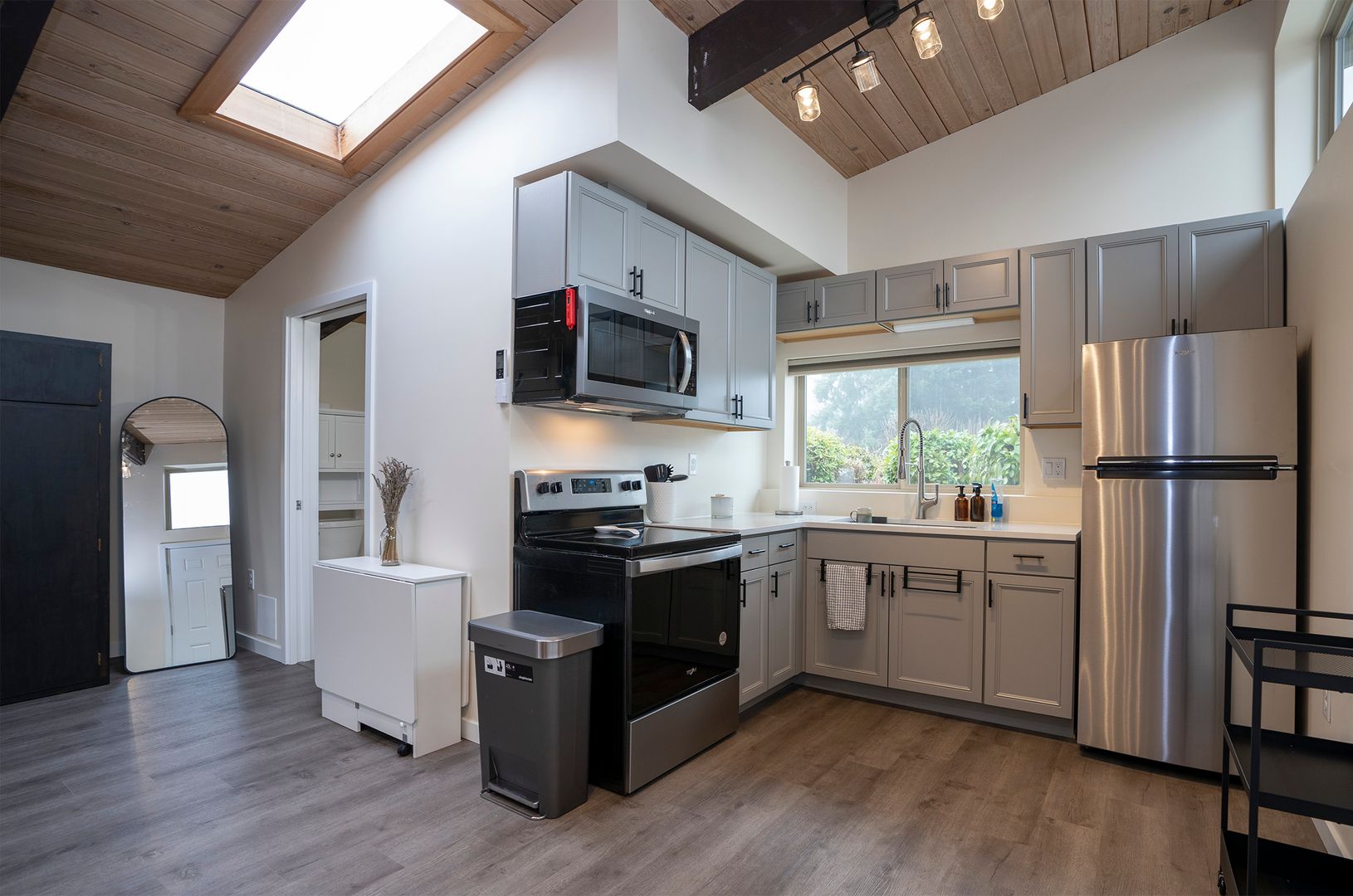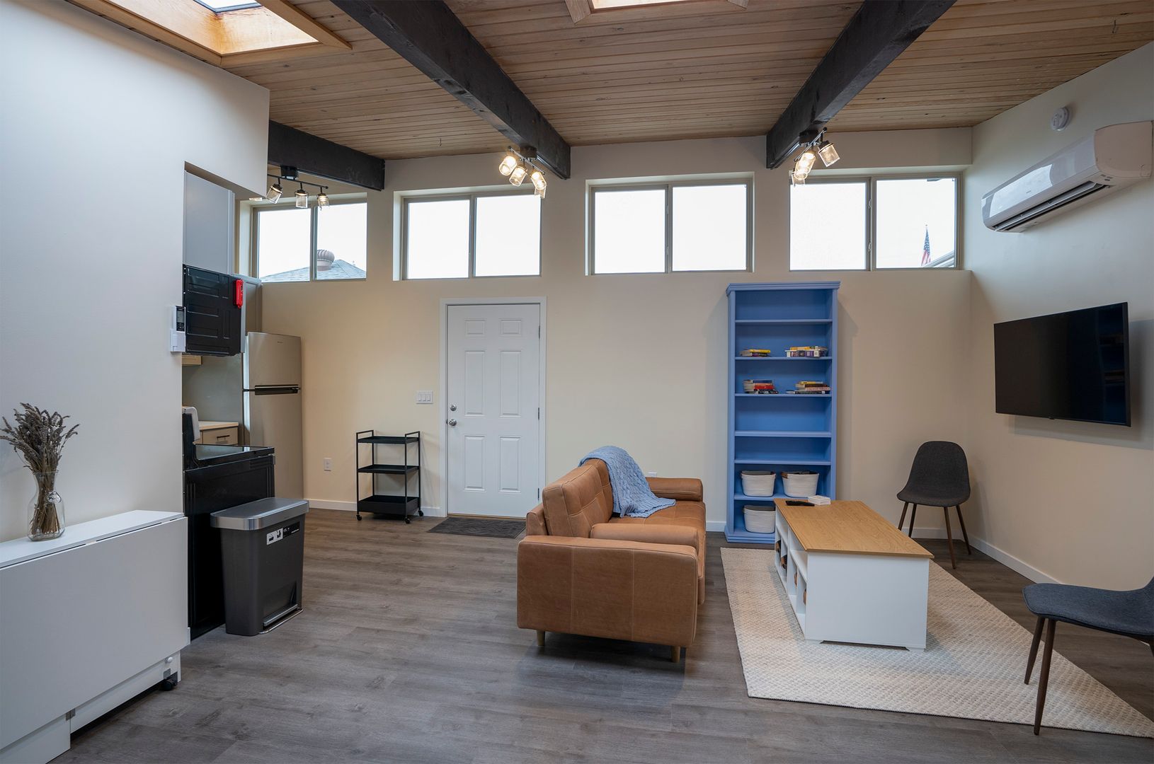 The vaulted ceiling's wooden pattern adds sophistication to the minimalist aesthetic, while roof windows fill the space with natural light, creating a modern and calming ambiance. The kitchen blends essential appliances for functional style. Living and bedroom areas feature a minimalist interior, creating a cohesive and relaxing retreat. Washer and dryer included for a hassle-free lifestyle.